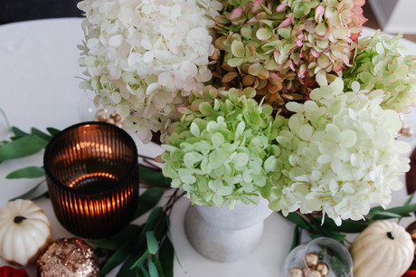 A centerpiece is a really important focal point when styling your table. This is where you can get creative and add a few beautiful elements to make your table sparkle. I love to start with a floral arrangement in the center and then 2 beautiful candle holders on either side. I wanted to create a bit of height on the table so I used a tall vase and added some hydrangeas from my garden. A simple bunch of flowers from the grocery store are just as effective. I fell in love with these warm caramel candle holders while designing this particular tablescape and they were actually the jumping-off point for my color scheme.